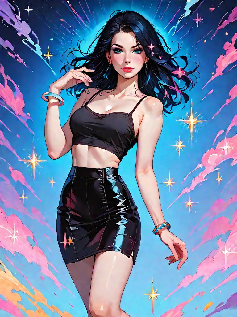 1girl, source_comics, realistic face, full body shot, Woman, modern minimalist, black leather strapless crop top, high-waisted cream wide-leg trousers with turned-up cuffs, layered gold chain necklaces, photo studio background