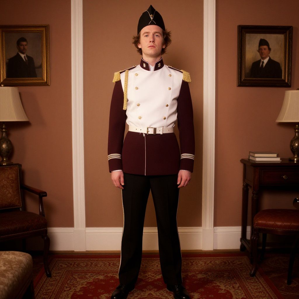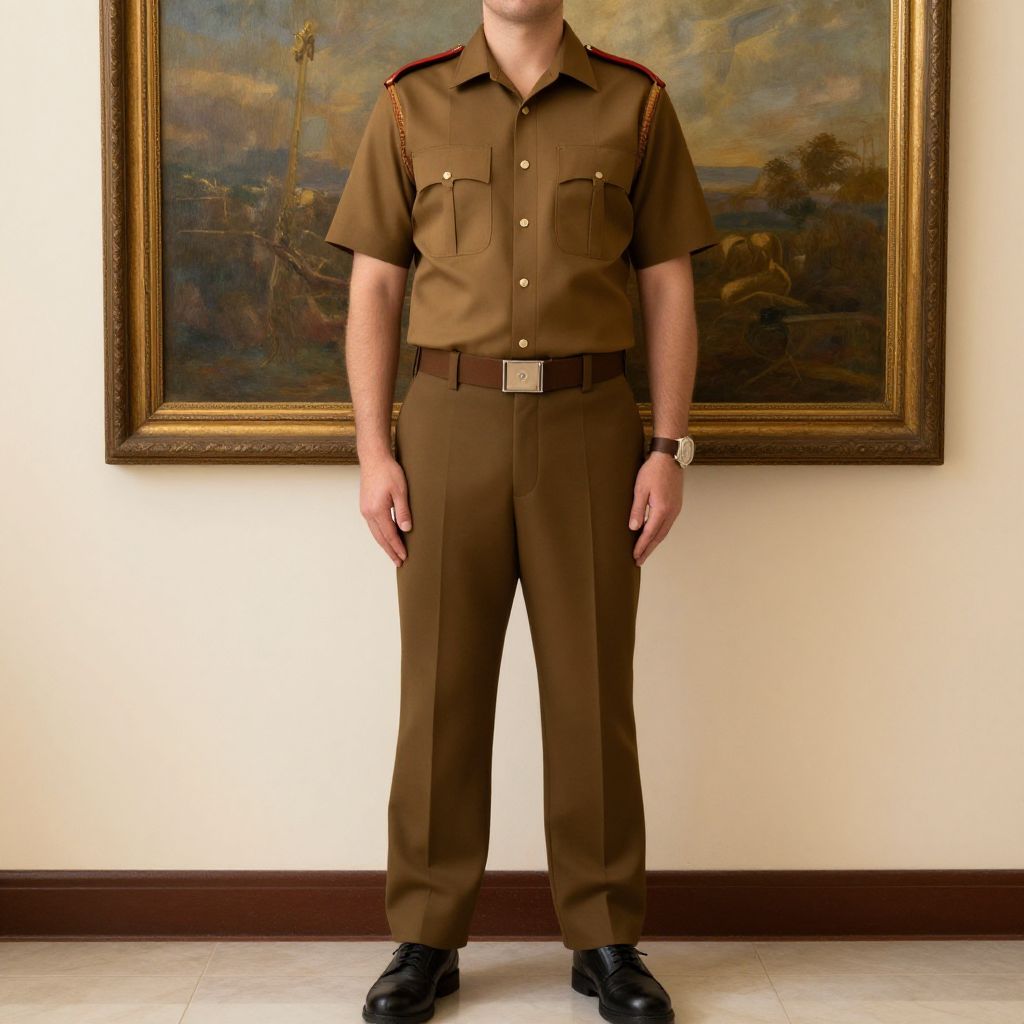 "Formal Khaki Outfit, man in uniform standing in front of a painting"