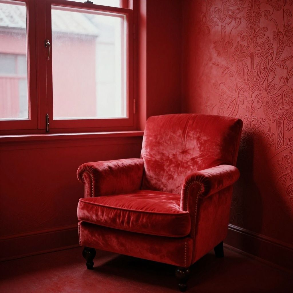 Red monochromatic room featuring vintage decor, plush velvet armchair, red textured walls with intricate patterns, soft natural light streaming through a window, evoking a nostalgic and intimate vibe.