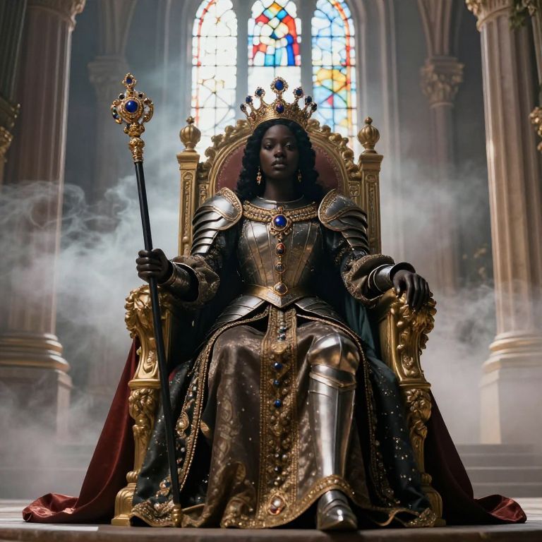 Black queen sitting on throne, adorned in intricate armor mixed with regal garments, holding a scepter topped with jewels, set against a backdrop of swirling mist and towering pillars, illuminated by soft rays of sunlight filtering through stained glass windows.