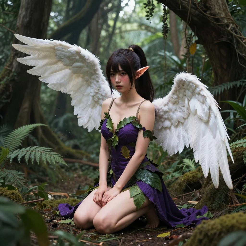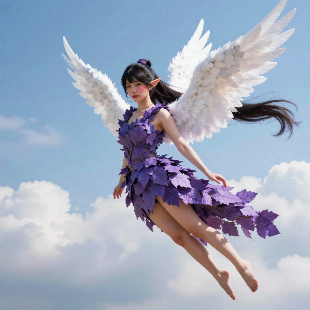Masterpiece, 8k, perfect ligthing, adult, female, looking at viewer, cinematic lighting, Vidia, (VidiaWaifu:1.1), single ponytail, extra long ponytail, dress, (extra long white fairy wings), long wings, purple clothes, clothes made from leaves, dark hair, pointy ears, shrunken, flying, sky, clouds, blush, pixiedust