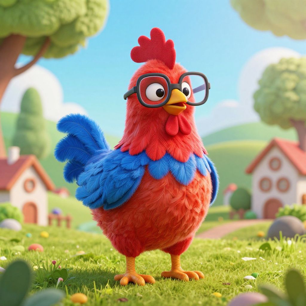 CGI cartoon chicken with red feathers, blue wings, large black glasses, standing on green grass, sunny village background, vibrant colors.