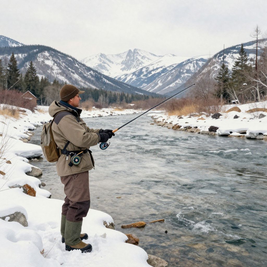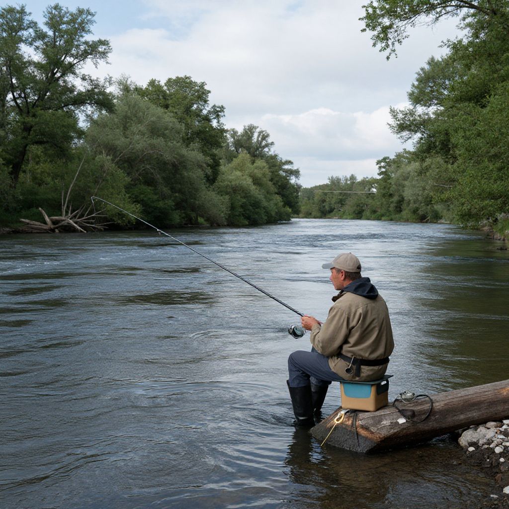 Man fishing by a serene river, casting his line amidst vibrant green grass, colorful wildflowers, and rippling water, with a backdrop of distant mountains and a partly cloudy sky.