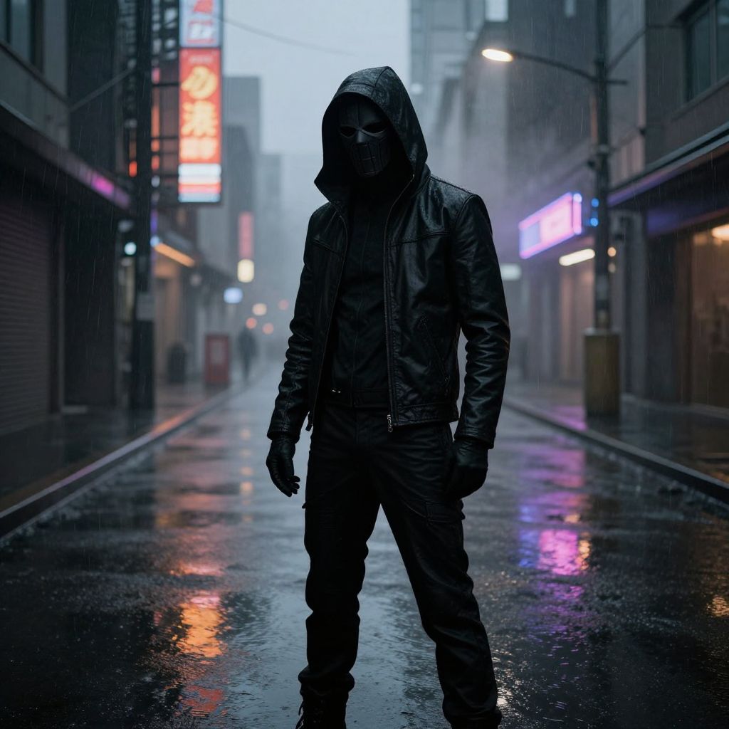 A man with a detailed black mask covering his face, wearing a sleek, form-fitting black outfit with a high-collared hood that fully obscures his upper body and shoulders, standing in a dimly lit, rainy urban environment with narrow streets, towering buildings, and reflections of vibrant neon signs shimmering in the rain-slicked puddles. The atmosphere is mysterious, tense, and slightly ominous, with fog curling around the edges of the scene and streetlights casting long, distorted shadows. The man's posture is upright and deliberate, emphasizing his enigmatic and watchful presence, adding to the sense of suspense and intrigue in the scene.