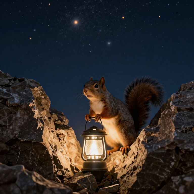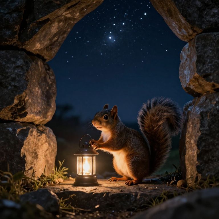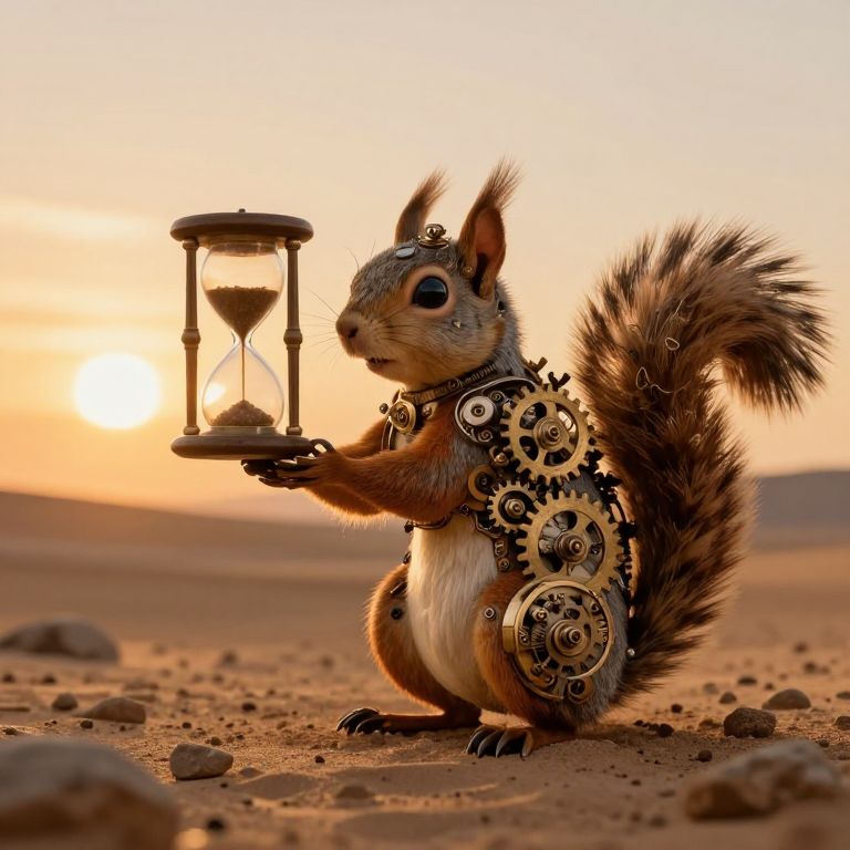 A clockwork squirrel winds itself using the gears of forgotten hourglasses, rebuilding time in a shattered desert of frozen sunrises.