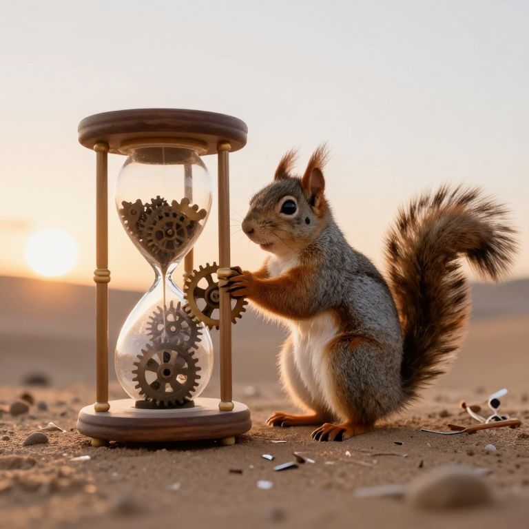 Photorealistic digital artwork of a small, grey and brown squirrel with a bushy tail, standing on a sandy desert floor. The squirrel is holding and manipulating metal gears inside a transparent, hourglass-shaped wooden stand. The sun is setting in the background, casting a warm, golden light. The hourglass contains a top section with fewer gears and a bottom section with more gears, creating a sense of time passage. Small rocks and sand are scattered around the base of the stand. The overall composition combines realistic textures with a whimsical, almost magical theme.