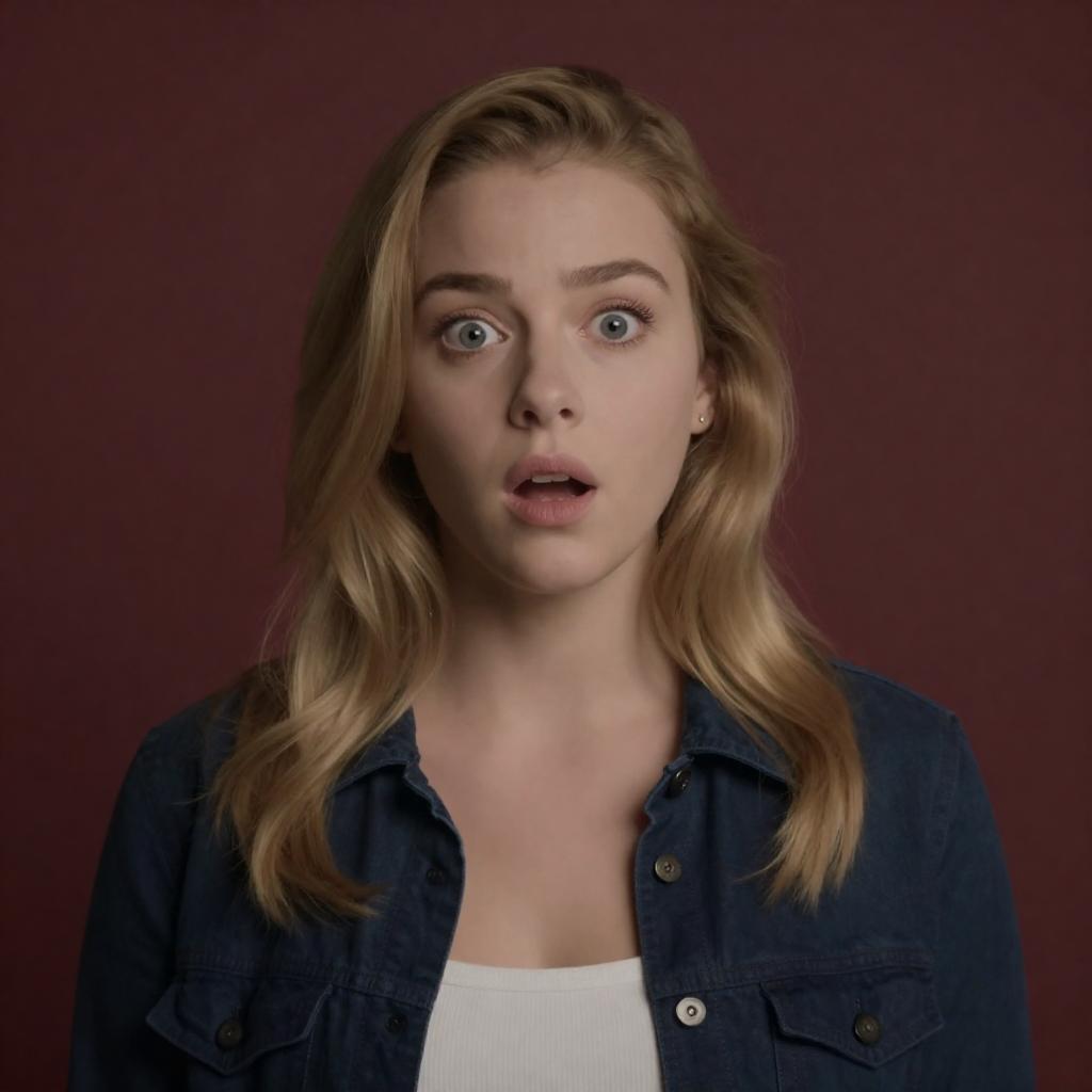 Blonde woman with shoulder-length hair, wearing a white floral tank top and blue jeans, stands in a doorway, mouth open, right hand gesturing. Purple wall with photos and floral decoration in background. Dimly lit stairway. Casual, surprised expression.