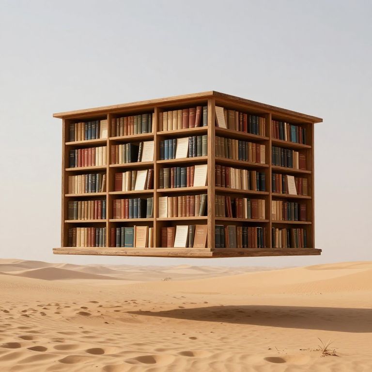 Photorealistic digital rendering of a wooden, cube-shaped library floating in a desert, with numerous colorful books neatly arranged on all six sides.