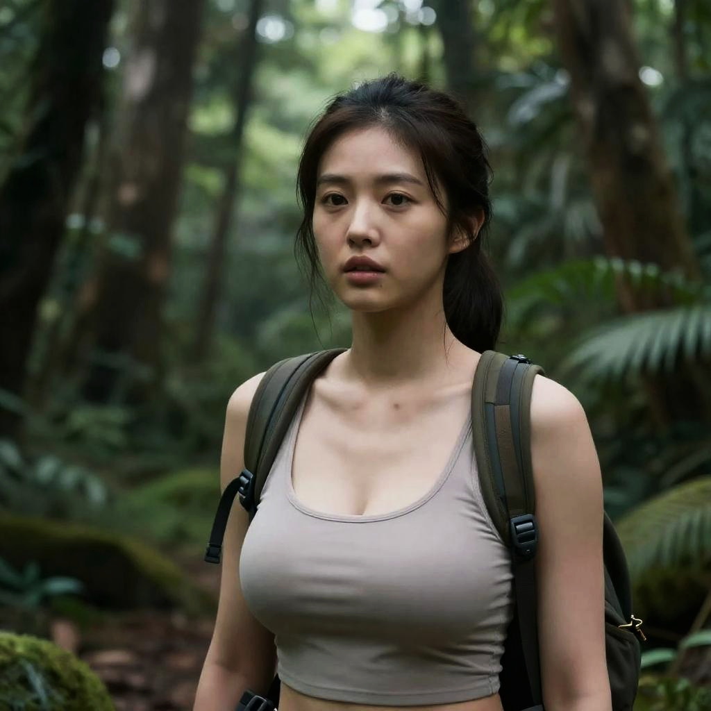 Ray Tracing, realistic, detailed, realistic details, dramatic, 1 girl, 21 years old korean cute girl, (large breasts), (The intrepid explorer ventured deeper into the dense jungle, the canopy of trees above casting dappled shadows on the forest floor.)