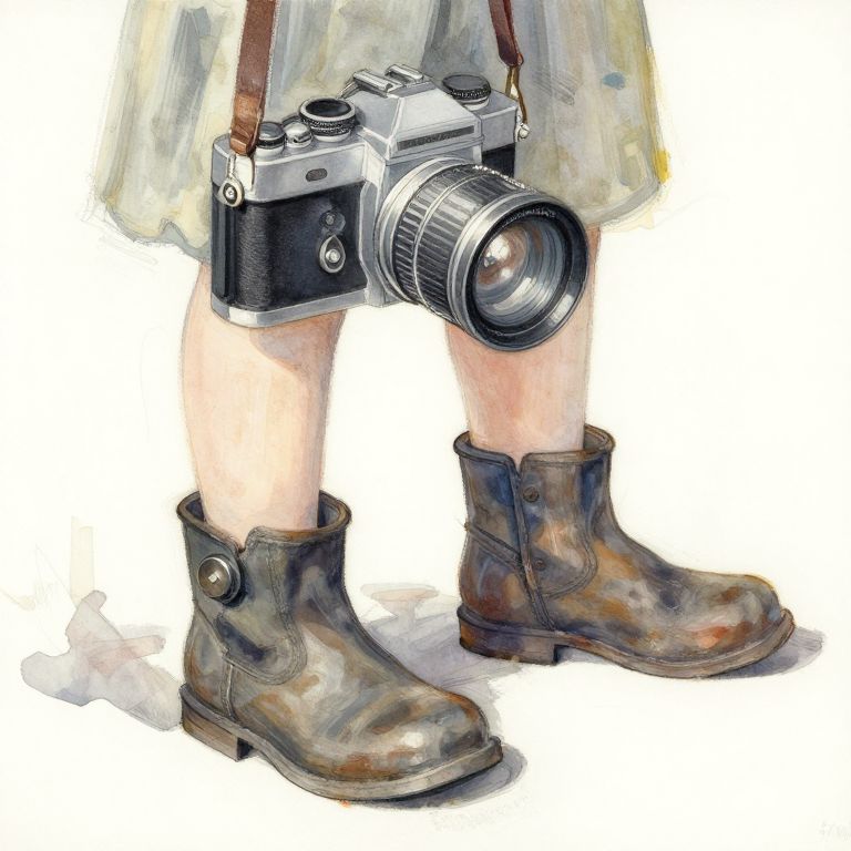 Digital painting of a person's legs wearing brown leather boots, holding a vintage silver camera with a large lens, and a beige skirt. White background.