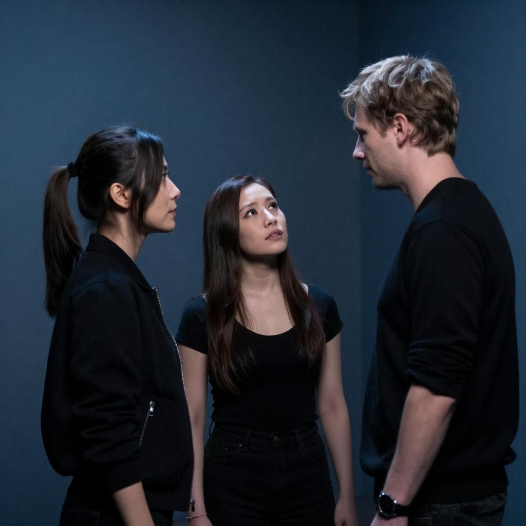Photograph of three people in a dimly lit, blue-hued room. A woman with dark hair in a ponytail stands on the left, wearing a black jacket. A woman with long brown hair and a black top is in the center, looking up at a man with blond hair and a black shirt on the right. They are closely facing each other, creating an intimate atmosphere.