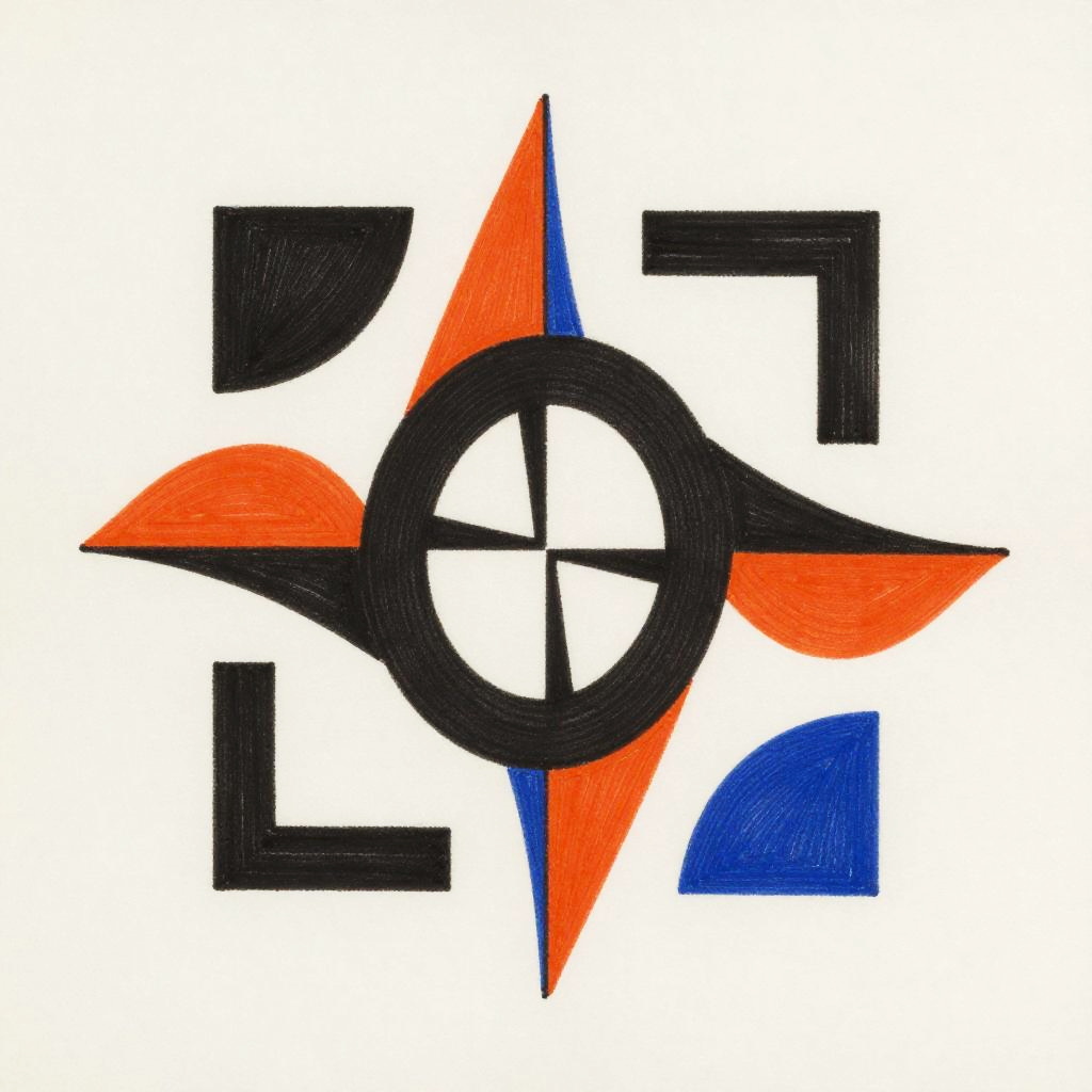 Drawing:1p83ai5jvpo= of an abstract geometric composition with intertwining shapes and bold color contrasts, sharp lines combined with fluid forms, modern art style exploring balance and movement, striking and visually engaging