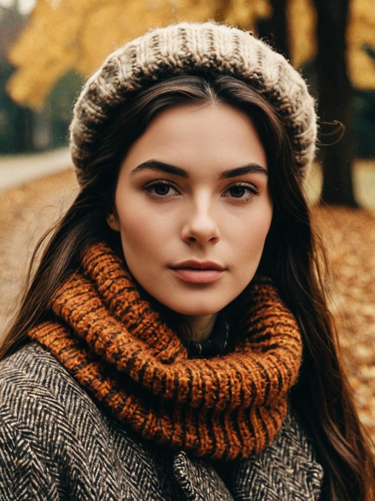 Close-up headshot of a young woman wearing a vintage cozy fall outfit featuring a knitted beige beret and a textured brown coat over a black knit sweater. The warm tones enhance the autumn atmosphere, with blurred fall foliage in the background.