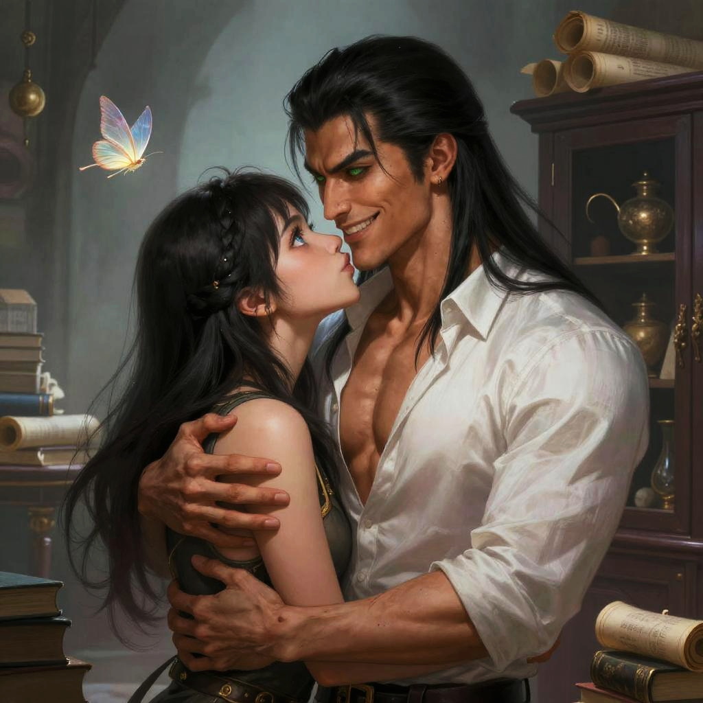 Digital art depicting a muscular, long-haired man with tan skin and a broad chest, wearing an unbuttoned white shirt, embracing a slim, black-haired woman with pale skin. They are about to kiss, with the man's hand on her back and the woman's arms around his waist. The background shows a dimly lit, cluttered room with shelves of books, rolled papers, and a glowing butterfly hovering above them. The man's expression is confident, while the woman's is dreamy. The art style is realistic with a fantasy touch, emphasizing romantic tension.