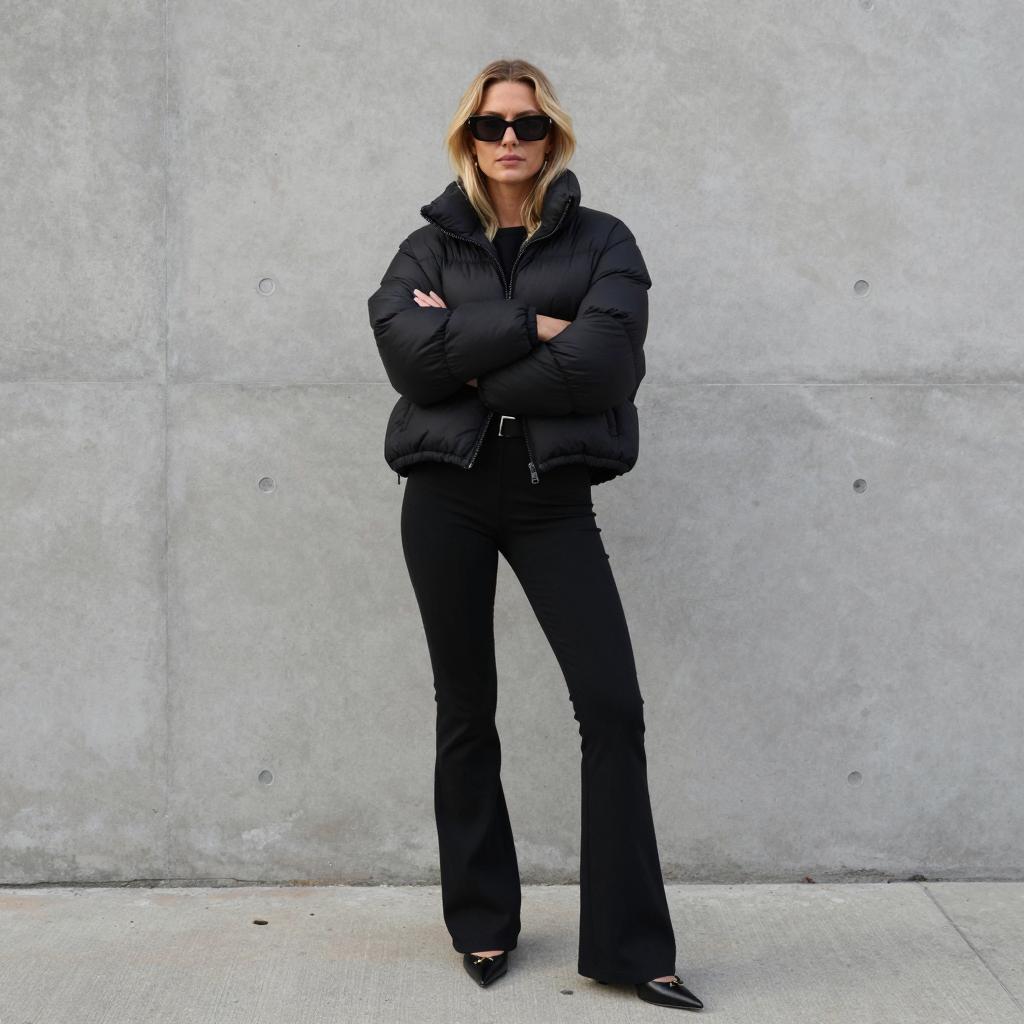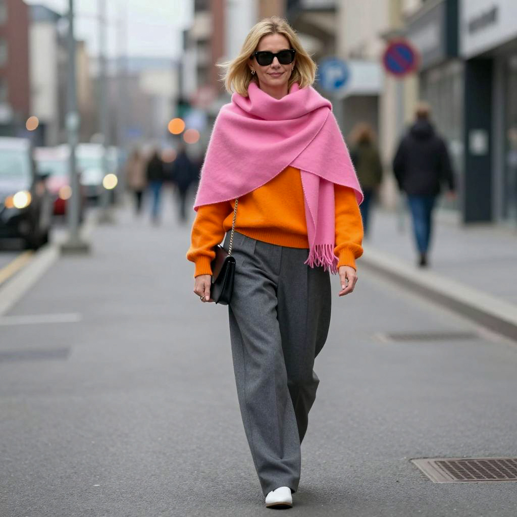 Photograph of a blonde woman with sunglasses, wearing a long, bright blue fur coat, black leather pants, black gloves, and carrying a beige and black handbag. She stands on a gray cobblestone sidewalk with a blurred urban background. She is walking, looking forward, with a neutral expression.