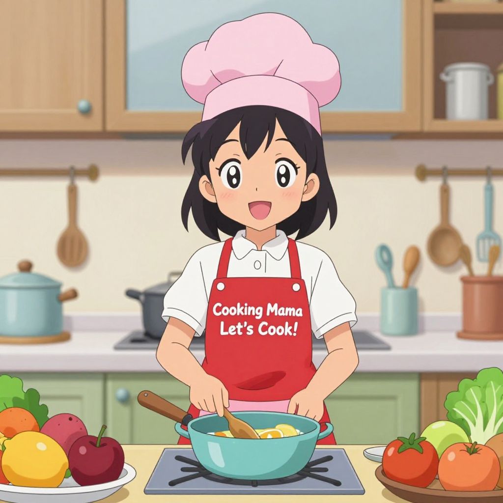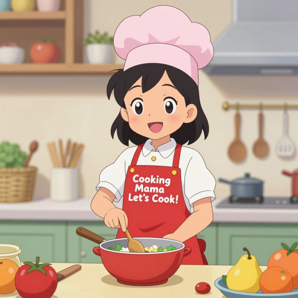 A cheerful anime-style illustration depicts a young woman in a pink chef's hat and red apron, smiling warmly as she prepares food in a cozy kitchen setting, surrounded by vibrant fruits and cooking utensils, capturing the playful and inviting essence of \"Cooking Mama Let's Cook!\" with bright, cartoonish visuals.