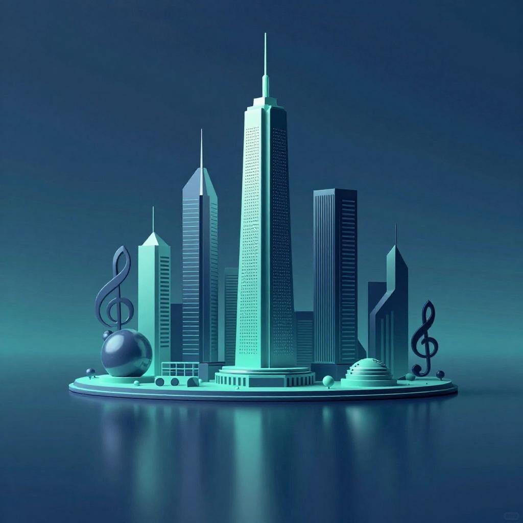 A detailed clef stippling 3D illustration of a futuristic underwater cityscape featuring sleek, polished skyscrapers and abstract iconic shapes. The image uses deep indigo and aquamarine hues with a tranquil, immersive atmosphere and a professional light gradient background. The city is reflected on the underwater surface, highlighting its minimalistic and elegant design, rendered in 32k resolution.