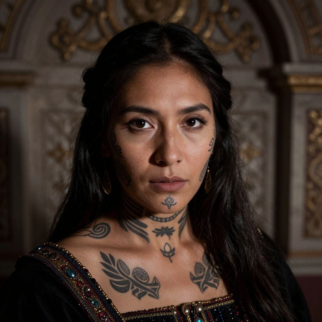 Create an ultrarealistic Renaissance-inspired portrait with chiaroscuro technique, showcasing an enchanting Andean woman adorned with intricate facial and neck tattoos. Her intense gaze, illuminated by dramatic lighting, casts deep shadows across her expressive features, highlighting a unique beauty and enigmatic aura. Capture this high-angle perspective against ornate architectural backdrop, seamlessly blending realistic textures and lighting to evoke historical grandeur and modern mystique.