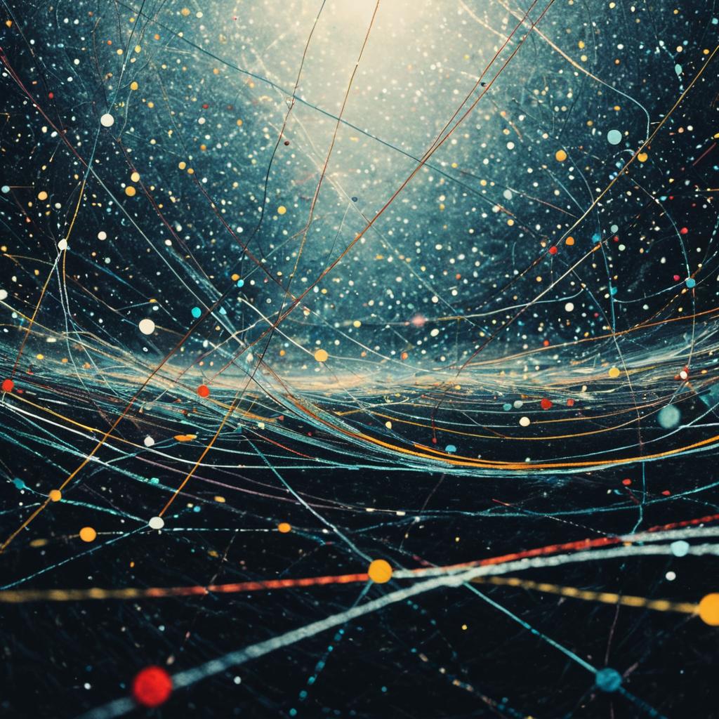 A visual representation of a quantum realm, shimmering particles, interconnected strings, 8k panoramic view, foggy and sunny, shifting light states, inspired by Picasso, Whistler, Matisse