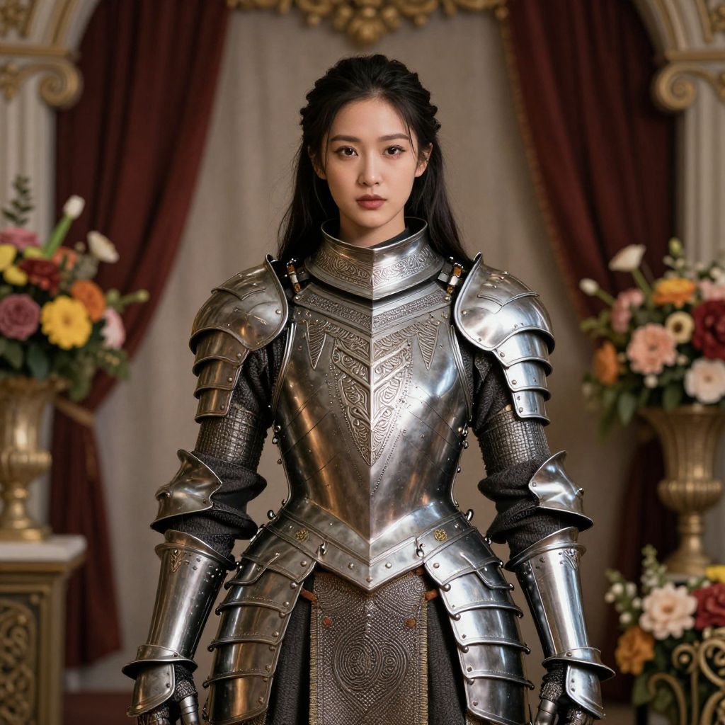 This stunning image features a woman in intricately designed armor, embodying a blend of fantasy and elegance. Surrounded by rich decor and vibrant flowers, she presents a captivating and powerful presence, showcasing a unique style that combines strength with beauty.
