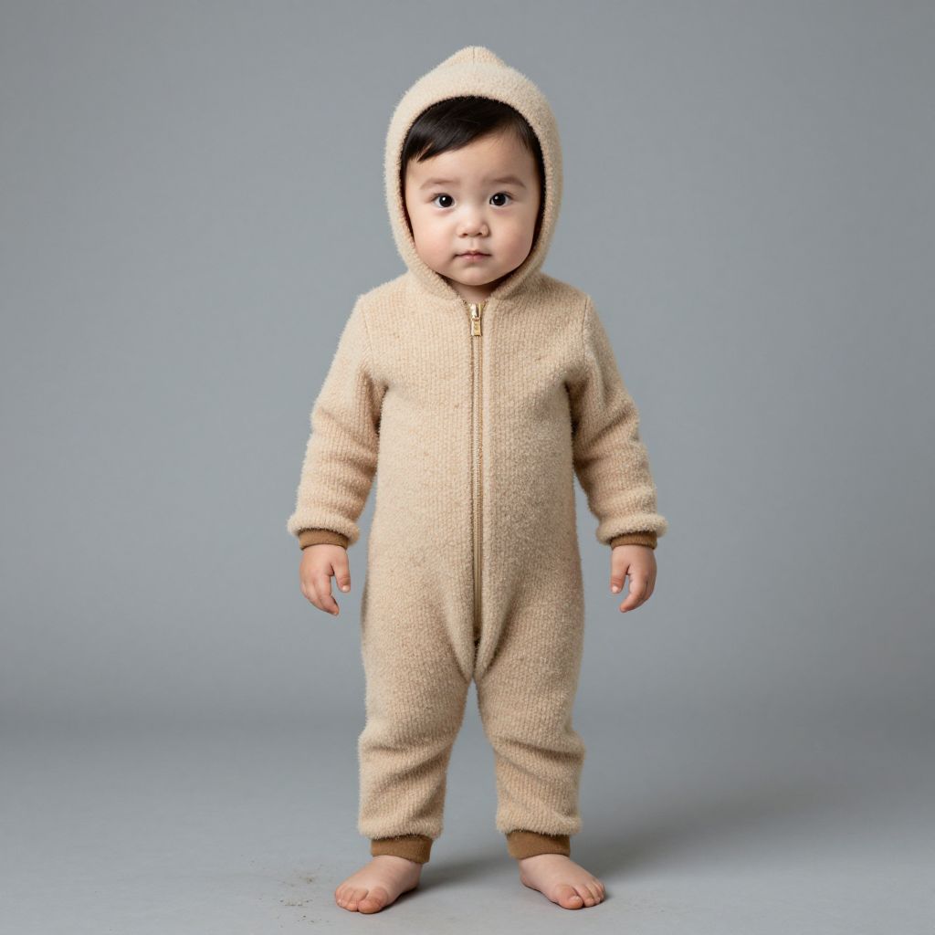 Baby peanut costume, solo, male focus, 1boy, barefoot, full body, child, realistic, grey background, looking at viewer, hood, dirty feet, black hair, onesie