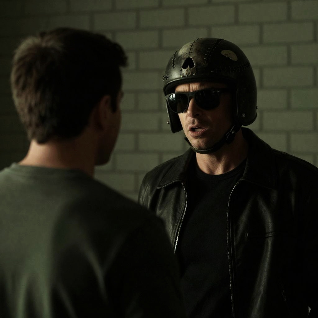 Photograph of a man with a stitched-up, skull-like helmet and dark sunglasses, talking to another man with short brown hair. Dim green light, brick wall background, second man's back facing camera. Intense facial expression on helmeted man.