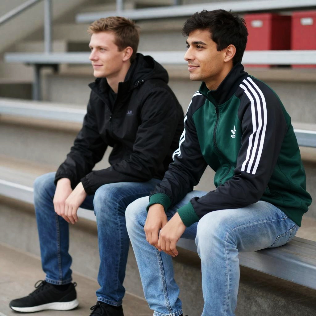 Two men sitting on a metal bleacher. The man on the left has short brown hair, wears a black jacket and blue jeans. The man on the right has dark hair, wears a green and black Adidas jacket, light blue jeans. Both look to the left, smiling. Background includes metal structures and red boxes.