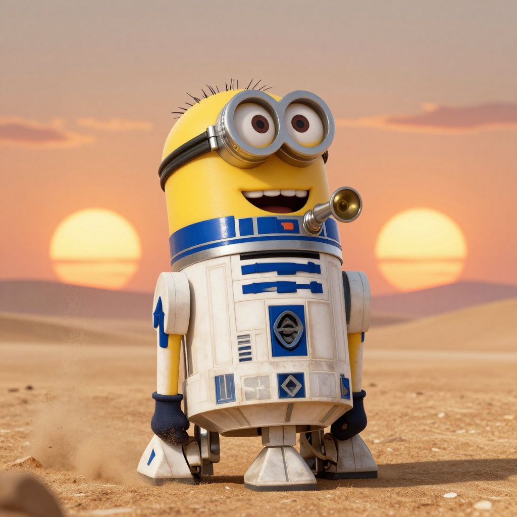 A playful scene of a Minion dressed as R2-D2, with the classic blue and white droid body, beeping and whistling, The Minion's yellow face peeks out from the top of the droid costume, showing a mischievous grin, The setting is a vast desert landscape with twin suns setting in the distance, typical of Tatooine, The Minion's tiny size adds a comical twist to the towering R2-D2 design, with dust swirling around in the wind, giving a lighthearted vibe to the Star Wars universe