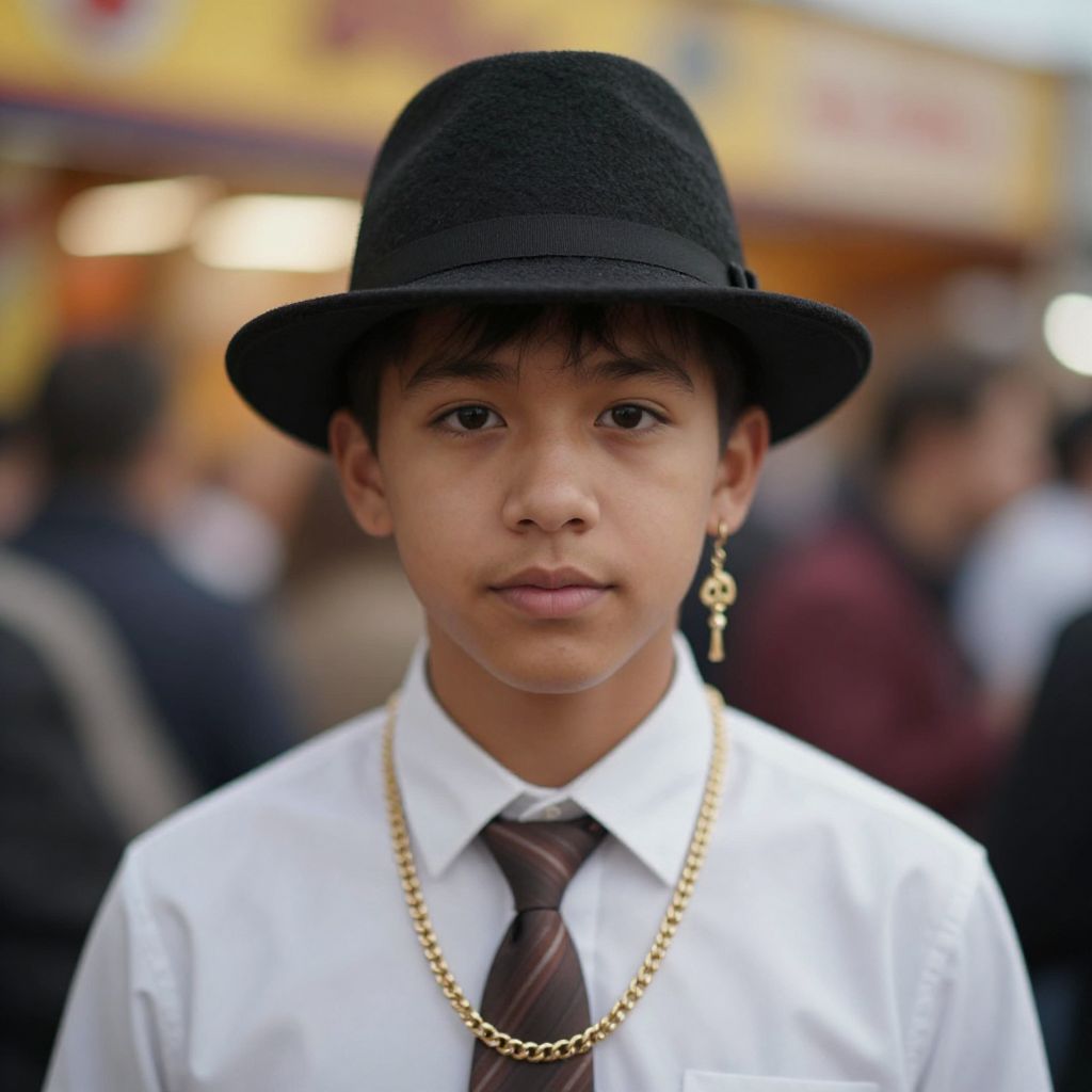 Party fair costume, jewelry, earrings, male focus, hat, 1boy, solo focus, blurry background, looking at viewer, blurry, necklace, ascot