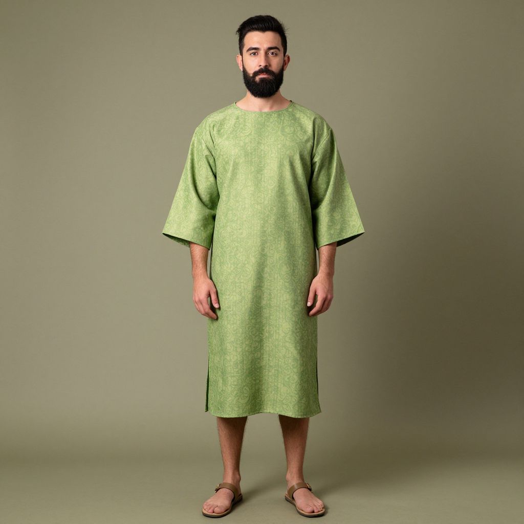 Photograph of a bearded man standing against a plain, light gray background. He has dark hair and a medium build. He is wearing a loose, light green tunic that reaches just above his knees, with short, slightly flared sleeves. He has fair skin and is wearing brown sandals. The tunic has a simple, textured fabric that appears slightly coarse. The man stands with his arms relaxed at his sides, and his expression is neutral. The lighting is even, with no shadows, highlighting the simplicity and focus on the man's attire and appearance.