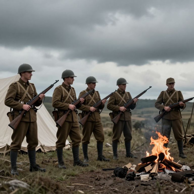 Epoca military scene with soldiers in authentic early 20th-century uniforms, vintage rifles, campfires, and tents, set against a moody cloudy sky, rugged terrain, emphasizing the historical wartime atmosphere with muted colors and somber tone.