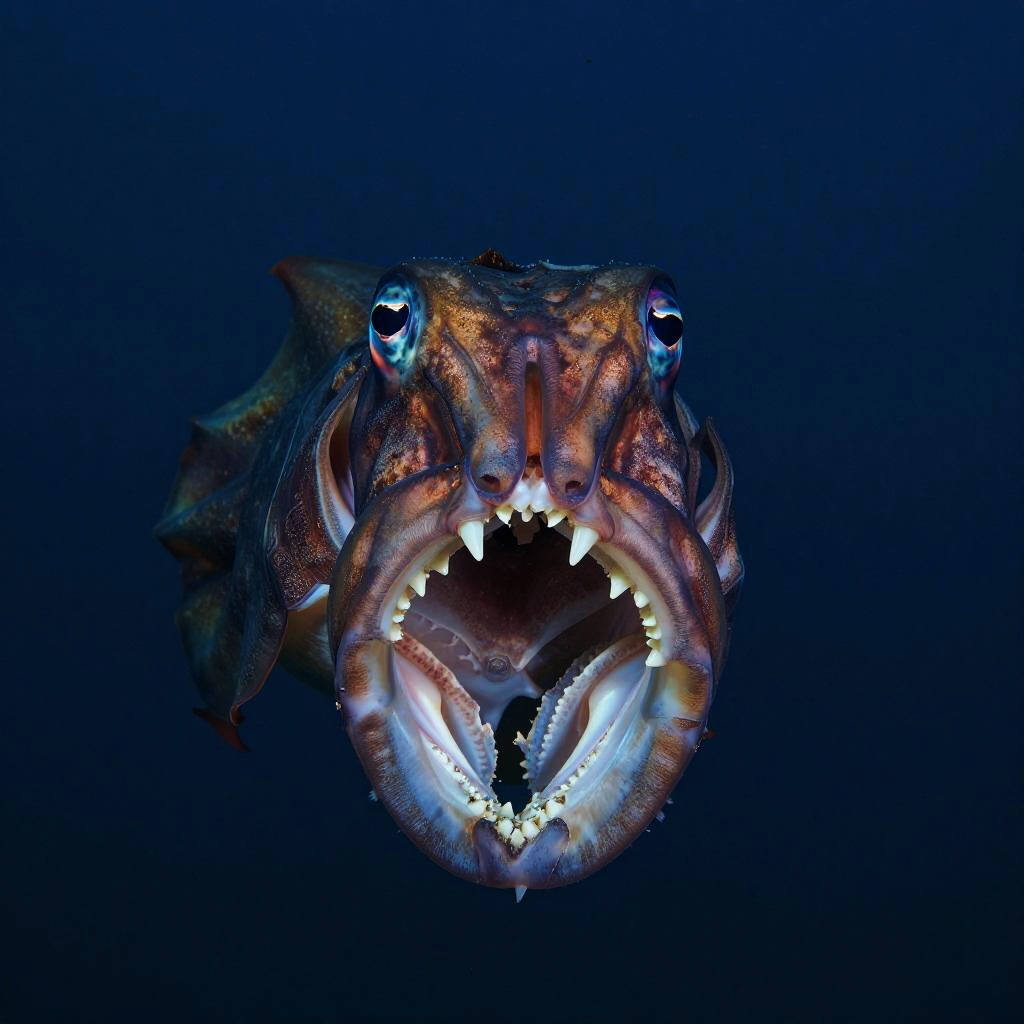 Close-up of deep sea monkfish with wide mouth and sharp teeth, murky blue water background, glowing eyes, rich texture, photorealistic undersea creature portrait, dramatic shadows