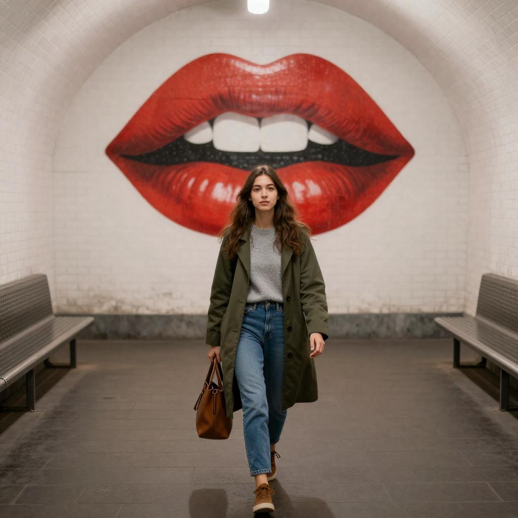 Young woman with long brown hair, green coat, gray sweater, blue jeans, brown bag, walking in underground tunnel. Background features large, detailed, red lips mural. Tunnel has curved white brick walls and metal benches on sides.