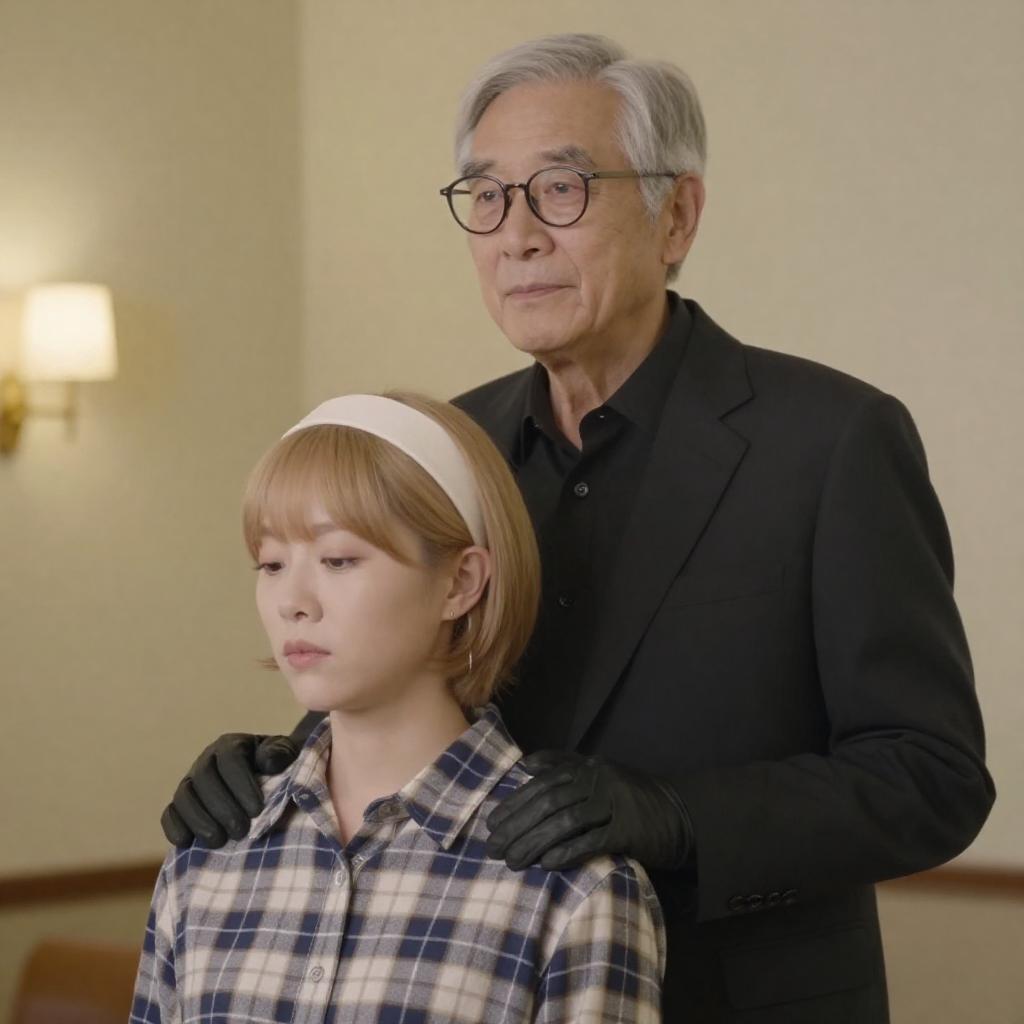 Photograph of an older man with gray hair, glasses, and a black suit, standing behind a younger woman with short blonde hair, a white headband, and a plaid shirt. The man wears black gloves and looks to the side, while the woman looks downward. The background is a blurred, yellow-lit indoor setting.