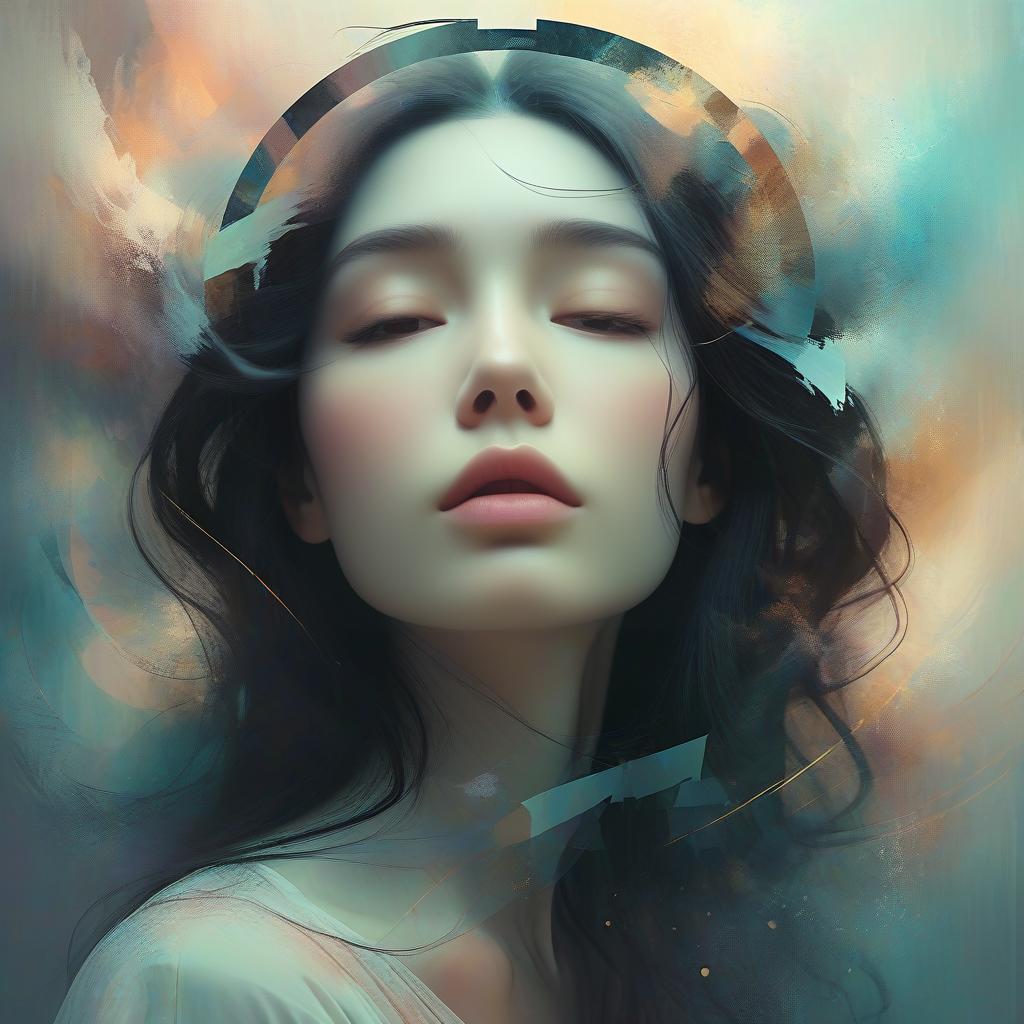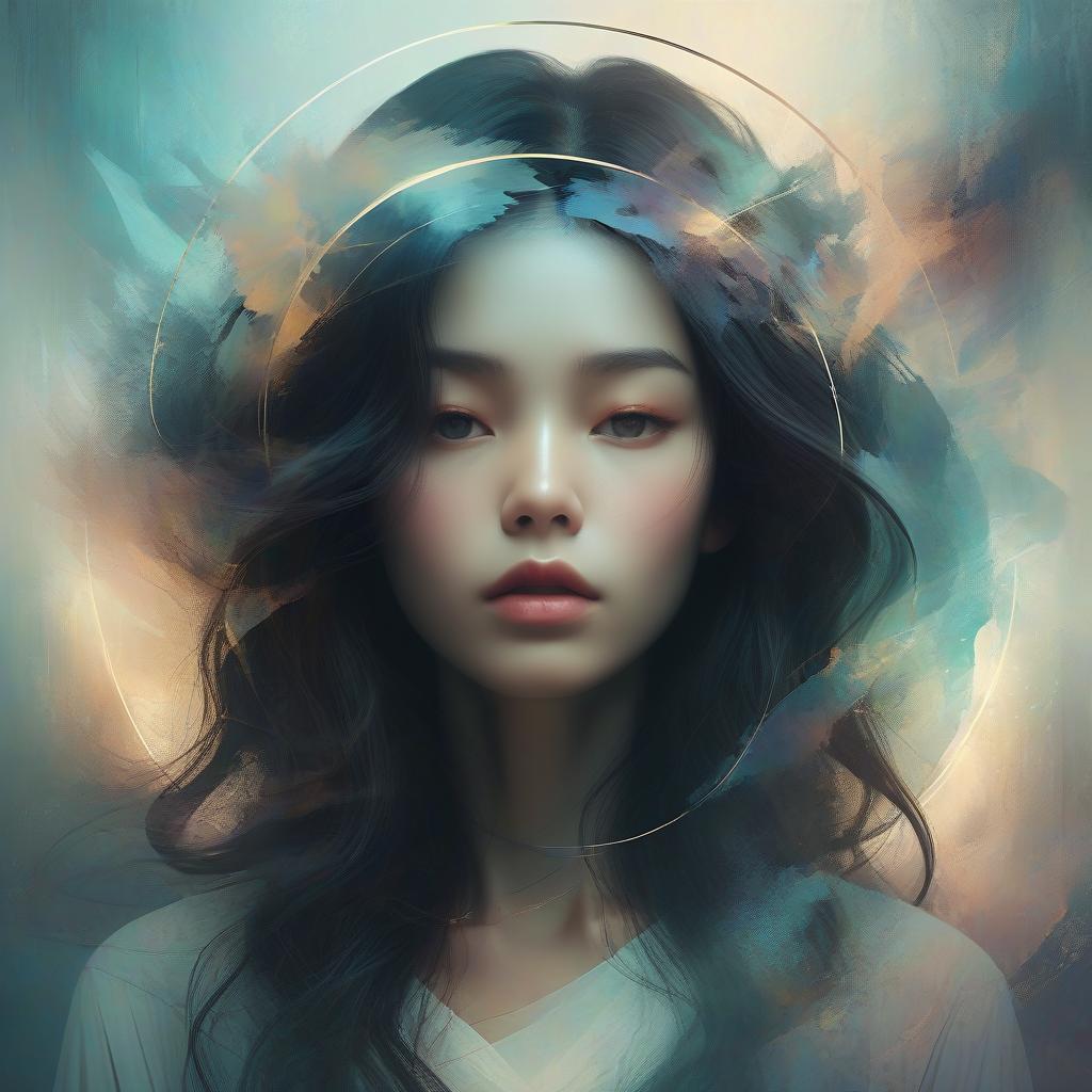 Introspective woman, serene expression, dark flowing hair blending into a surreal abstract background, intricate and geometric halo effect surrounding her head, soft and moody lighting, ethereal and introspective, inspired by surrealism and fantasy art, muted color palette with subtle textures.