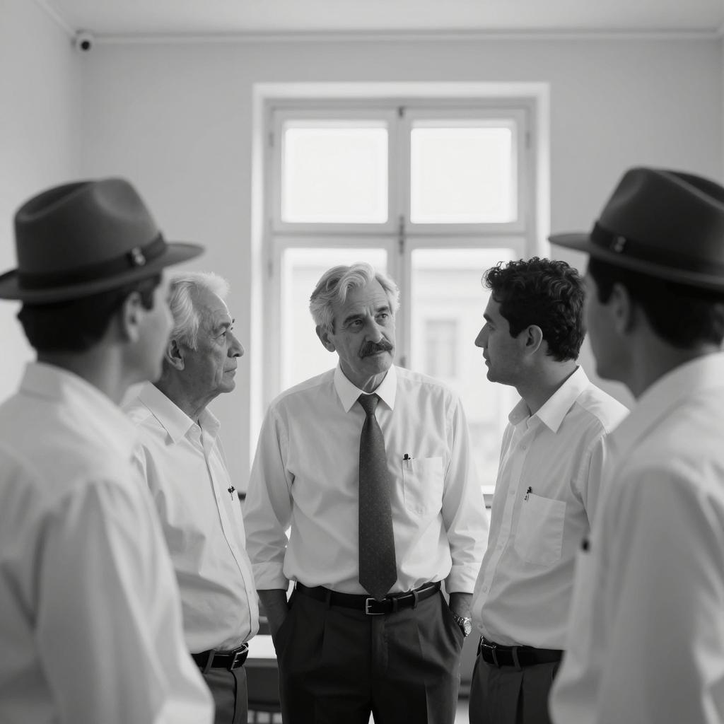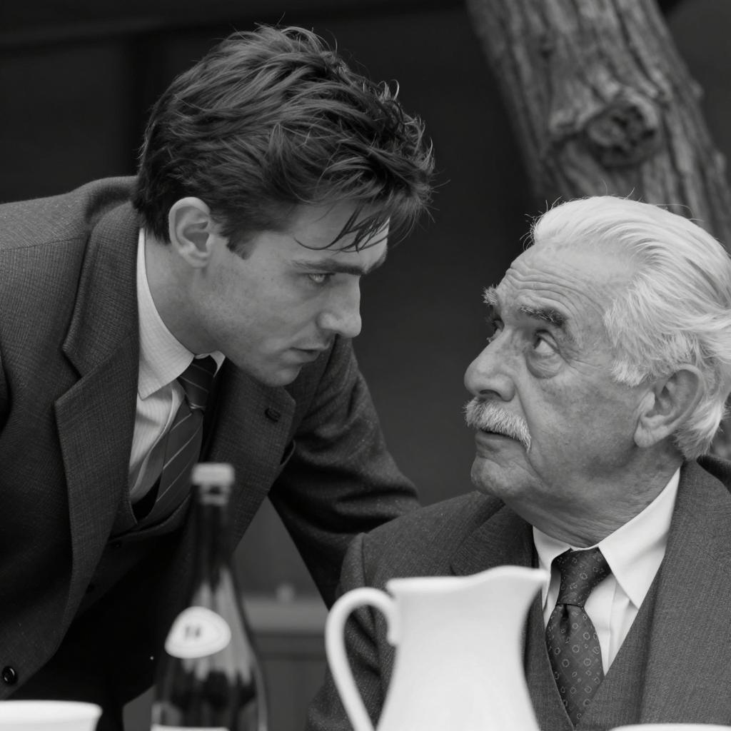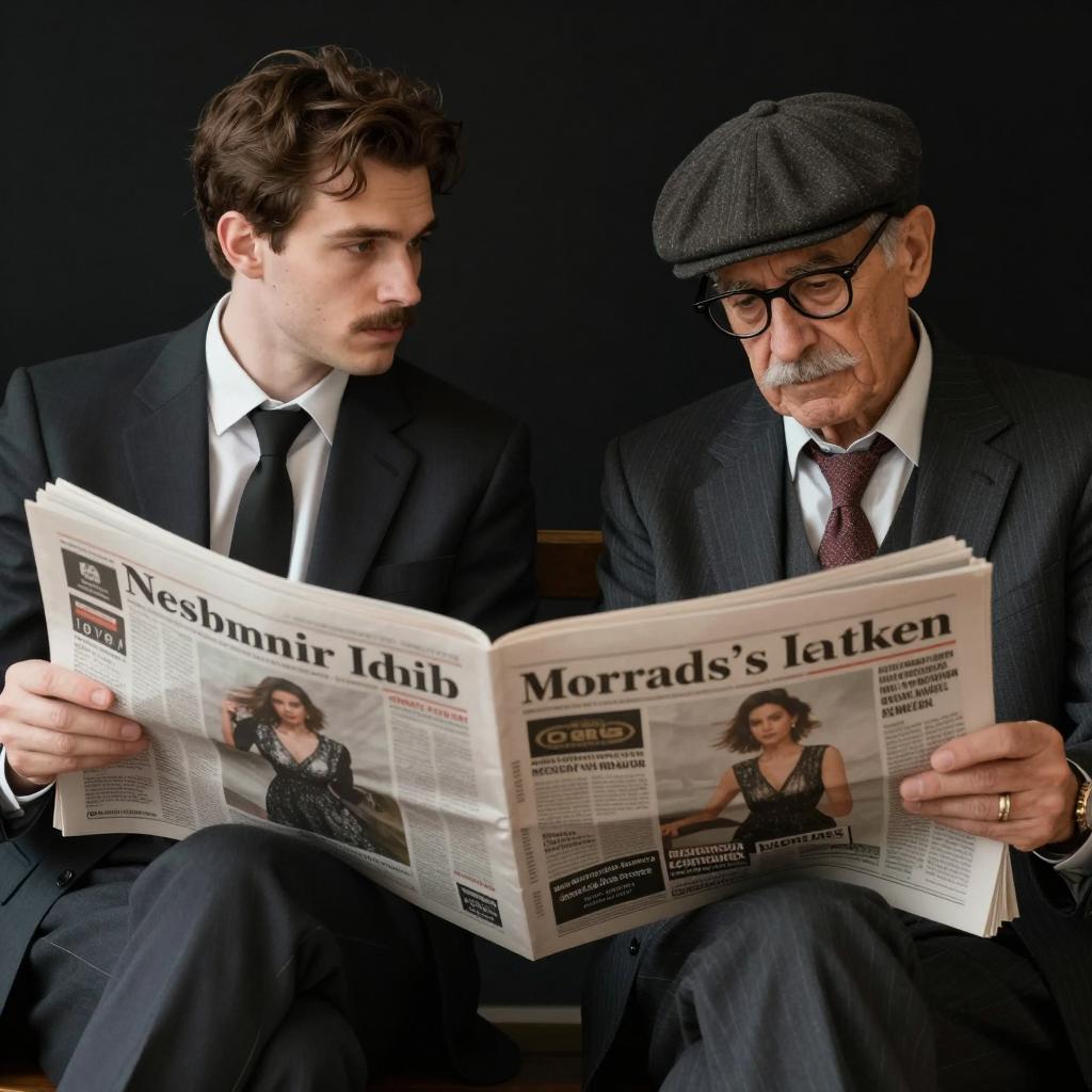 Black and white photograph of two men sitting, both holding newspapers. Young man with dark hair, mustache, dark suit, white shirt, black tie, looking to the right. Older man with glasses, flat cap, mustache, striped suit, looking at newspaper. Both men have their hands on newspapers. Older man's newspaper has a woman in a dress on the cover. Background is dark.