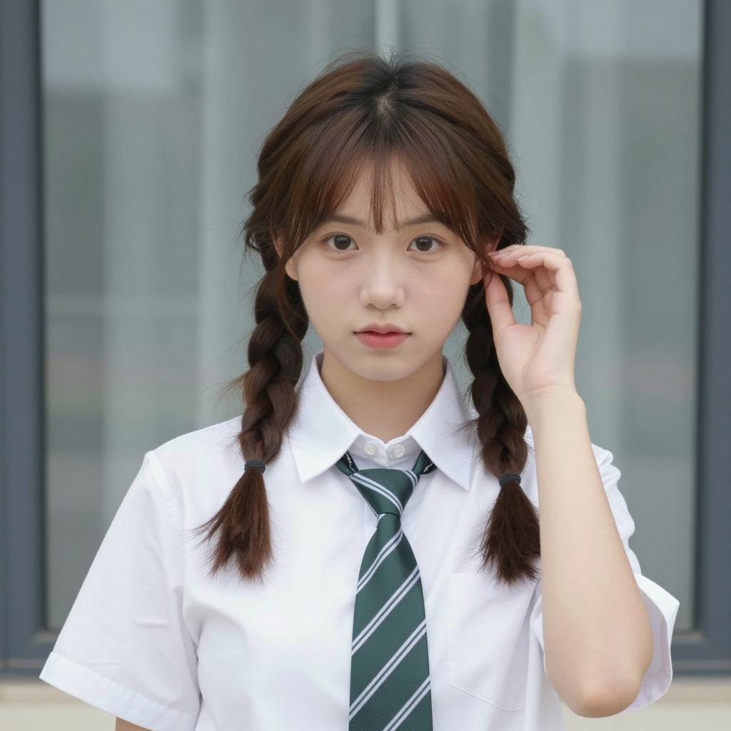 Sailor mini moon costume, photorealistic, anime-style, young Asian girl, school uniform, black sailor top with white stripes, long brown hair in braids, yellow and white ribbon, white shirt, brown belt, standing outdoors, blurred background, people in casual clothes, daytime, soft sunlight, serious expression, detailed ures, natural colors, realistic shadows, medium shot, slightly low angle, focused on face, natural light, school setting, Japanese-inspired attire, contemporary fashion
