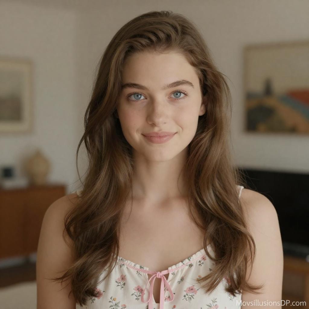 Photograph of a young woman with long, wavy brown hair and fair skin, wearing a white off-shoulder lace top and a black cross necklace. She gazes directly at the camera with a slight smile. The background features a softly lit wooden door and a blurred, sunlit window.