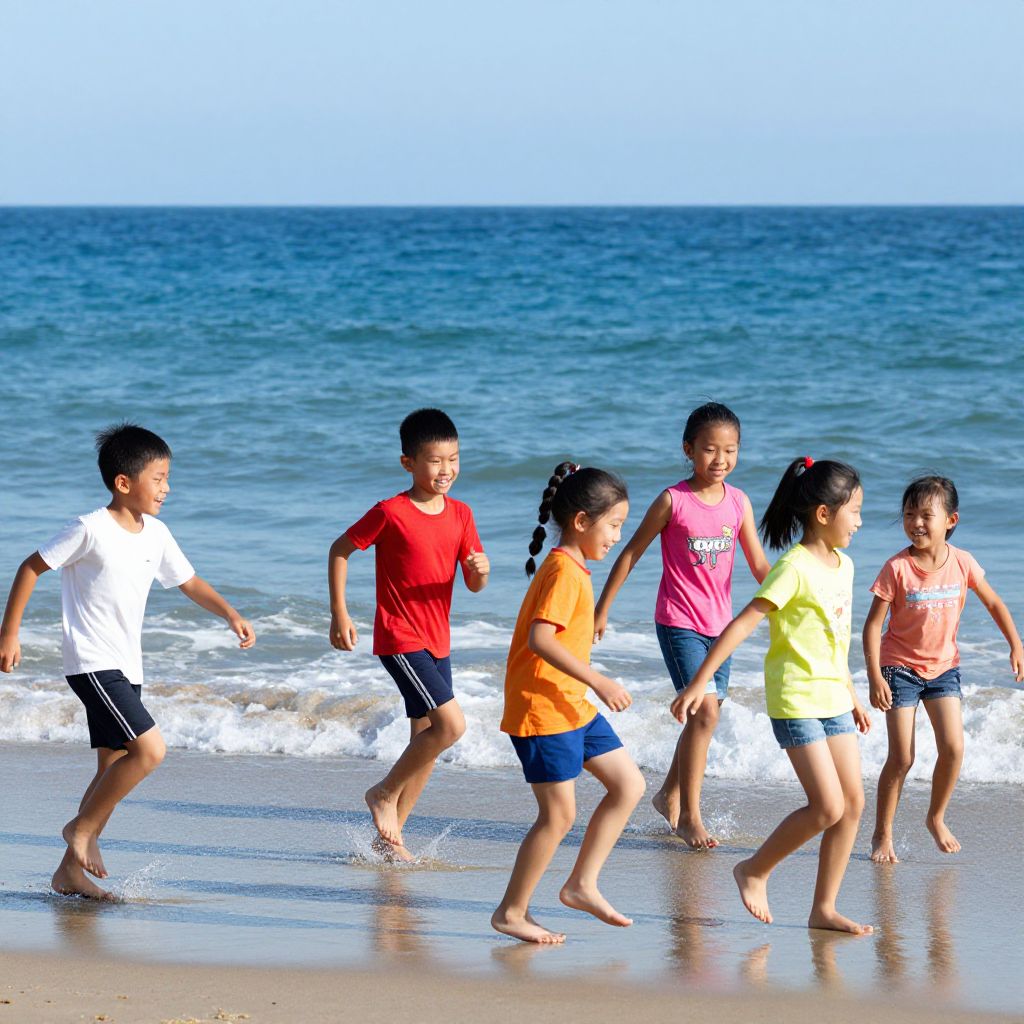 Children joyfully fly a vibrant red kite adorned with trailing heart-shaped ribbons, soaring high above a bustling urban street lined with tall apartment buildings under a bright, partly cloudy sky.