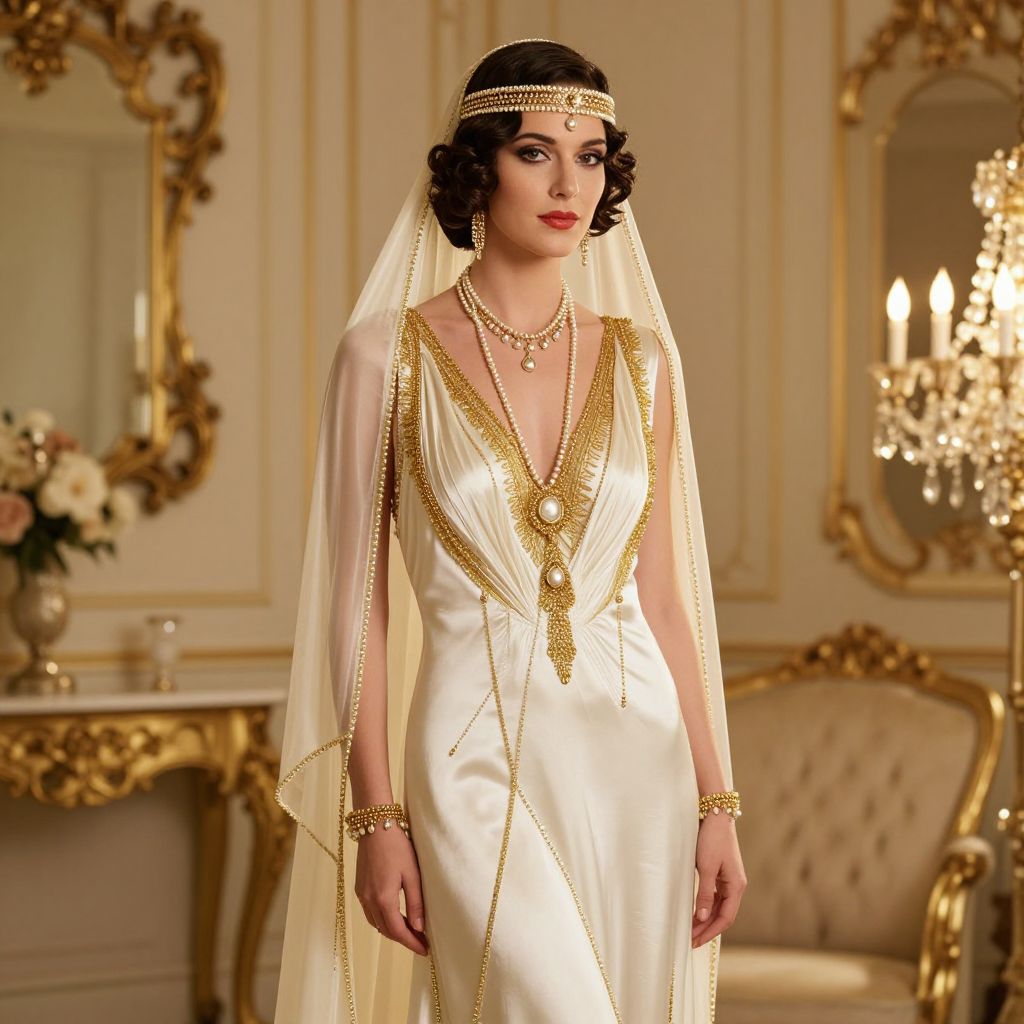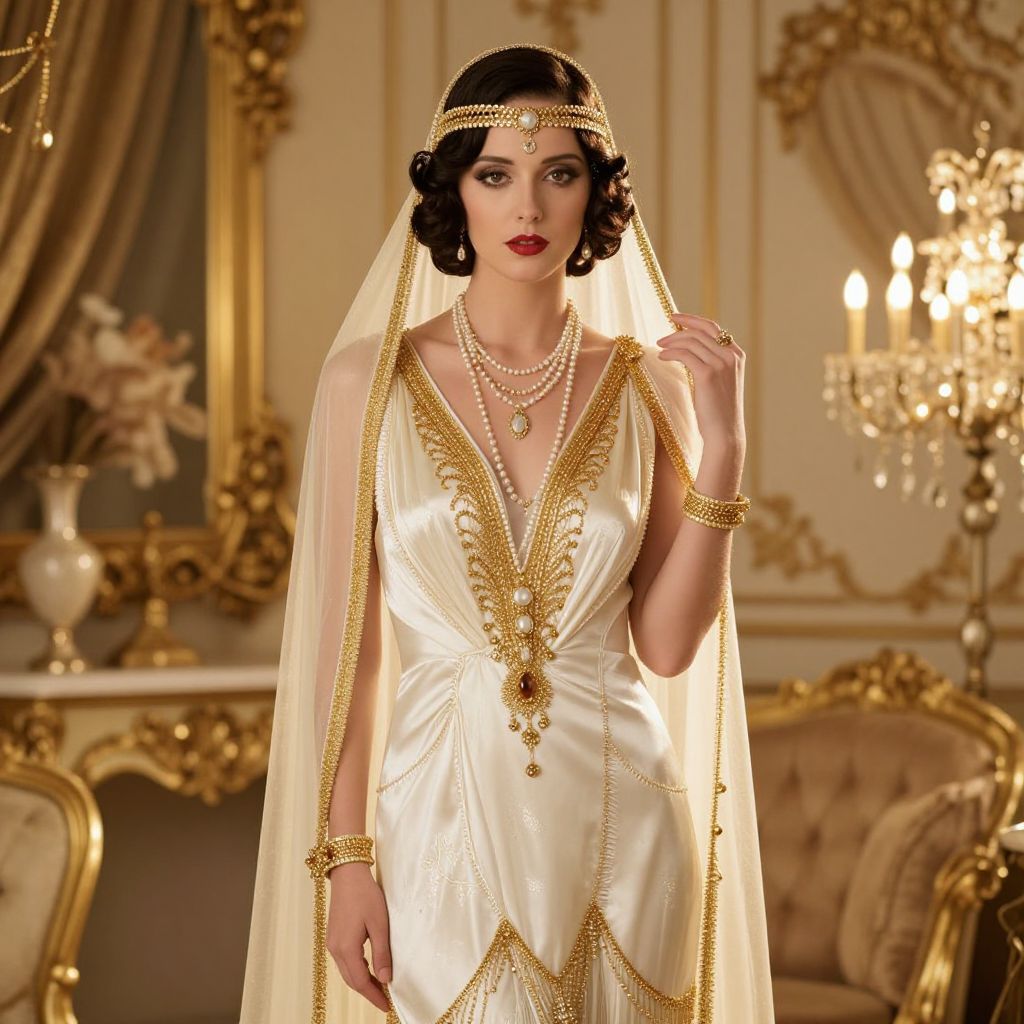 A woman in an elegant ivory gown adorned with gold embellishments exudes opulent 1930s wedding inspiration, set against a backdrop of luxurious decor featuring golden hour lighting and classic vintage aesthetics.
