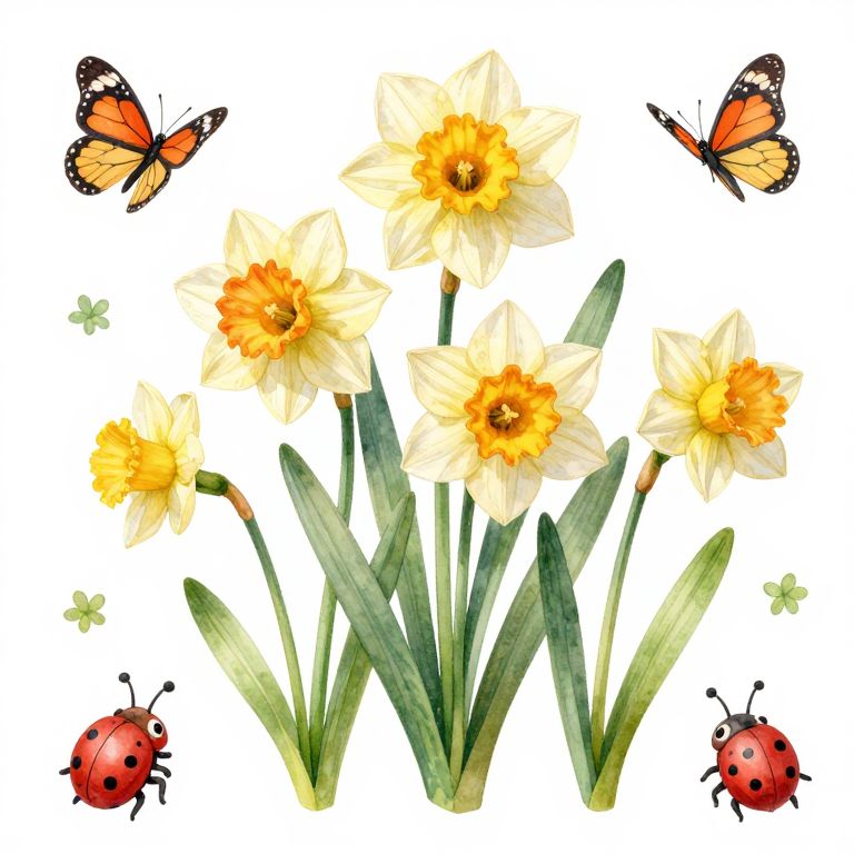 A whimsical watercolor illustration featuring daffodils, butterflies, and cute bugs, with a Pixar-style aesthetic and a white background.