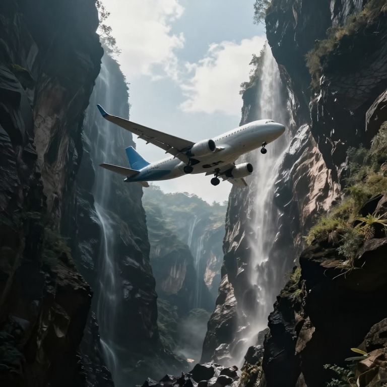 Photorealistic digital art: A white airplane with blue tail flies between towering, mist-covered rocky cliffs with waterfalls, under a bright, cloudy sky