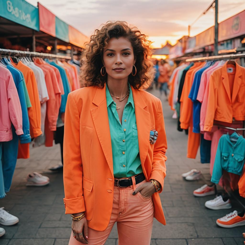Slim woman with wavy hair wearing an 80s-themed oversized sunset orange blazer with shoulder pads, pink graphic tee, acid-wash loose-fit jeans, and retro accessories. She stands confidently in an open-air market surrounded by racks of colorful neon and pastel clothing. The setting features vibrant apparel and a casual outdoor atmosphere.