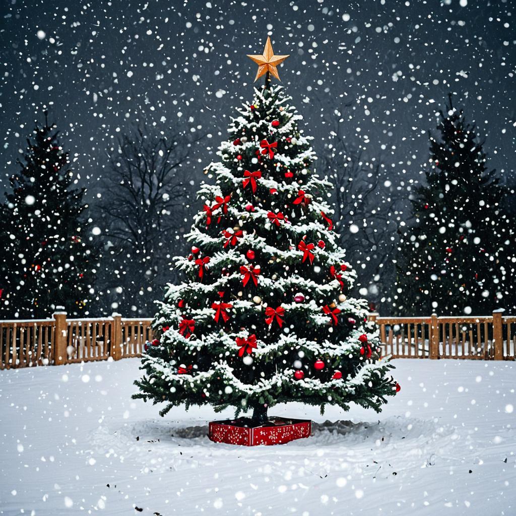 A Christmas tree covered in handmade wooden stars and red bows, standing amidst a swirling snowstorm. The decorations glow brightly against the snowy backdrop, creating a warm, festive contrast to the cold, wintry scene. Snowflakes and wind create a sense of movement around the tree, enhancing the magical, holiday atmosphere.