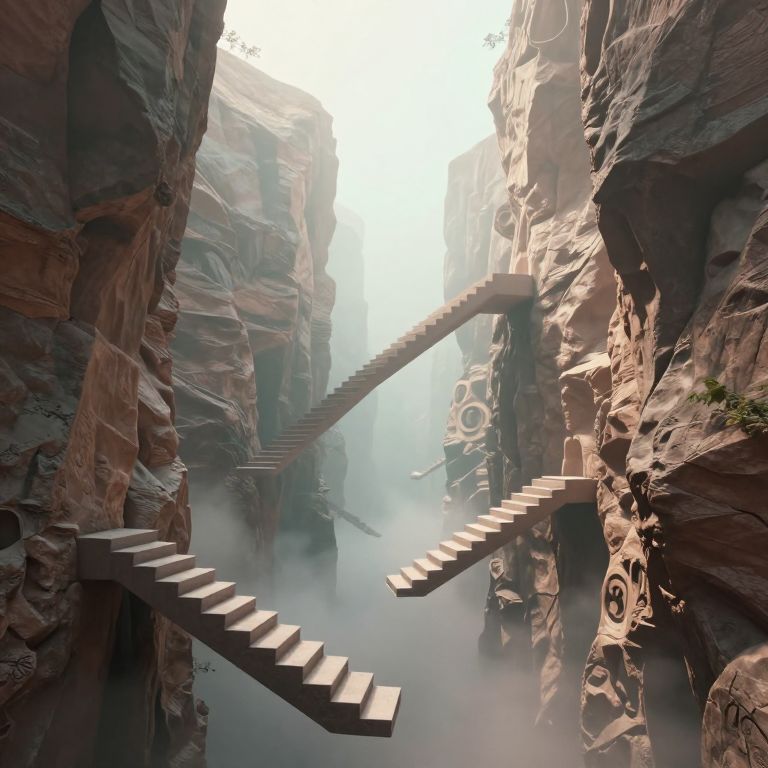 A CGI-rendered image depicts a mystical, rocky canyon with towering, textured cliffs in shades of red, brown, and gray. Two sets of white, modern, floating stone steps bridge the canyon, one ascending from the bottom left and the other descending from the top right. Mist swirls around the base of the steps, adding a mystical atmosphere. Sunlight filters through the canyon's narrow opening, illuminating the scene from above. The composition combines futuristic and natural elements, creating a surreal, otherworldly feel.