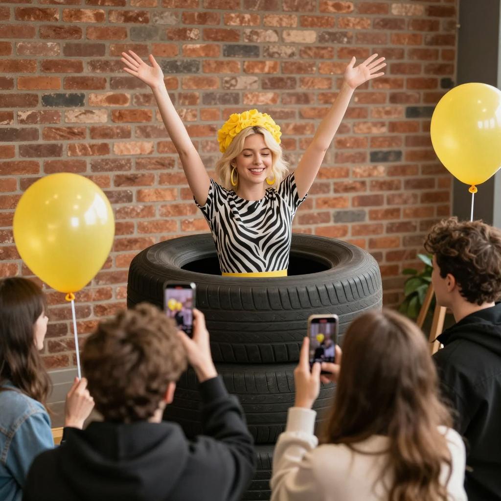 A blonde woman wearing a zebra-patterned top, yellow headpiece, and large hoop earrings sits inside a stack of black tires with her arms raised cheerfully. She is surrounded by casually dressed people, some holding yellow balloons and others recording the scene with their smartphones. The setting features a brick wall background, creating a lively atmosphere.