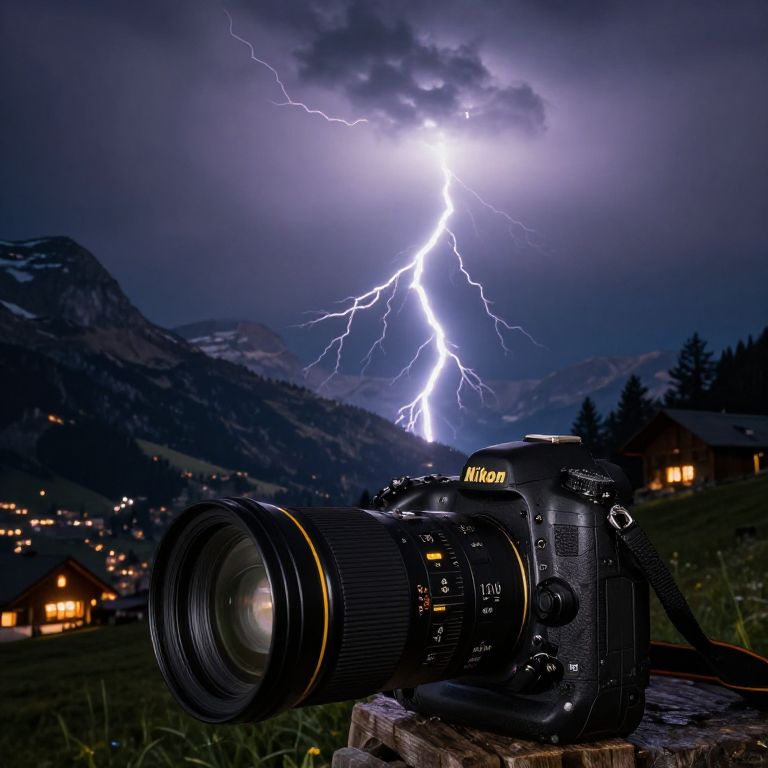 Photograph of a Nikon camera with lightning bolt striking above, set against a dark, stormy mountain night sky with illuminated houses.