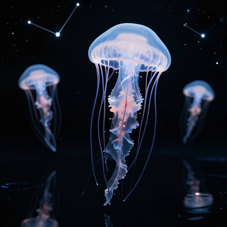 A floating desert composed of giant, translucent jellyfish drifts silently above an ocean of black glass, reflecting constellations from forgotten universes.