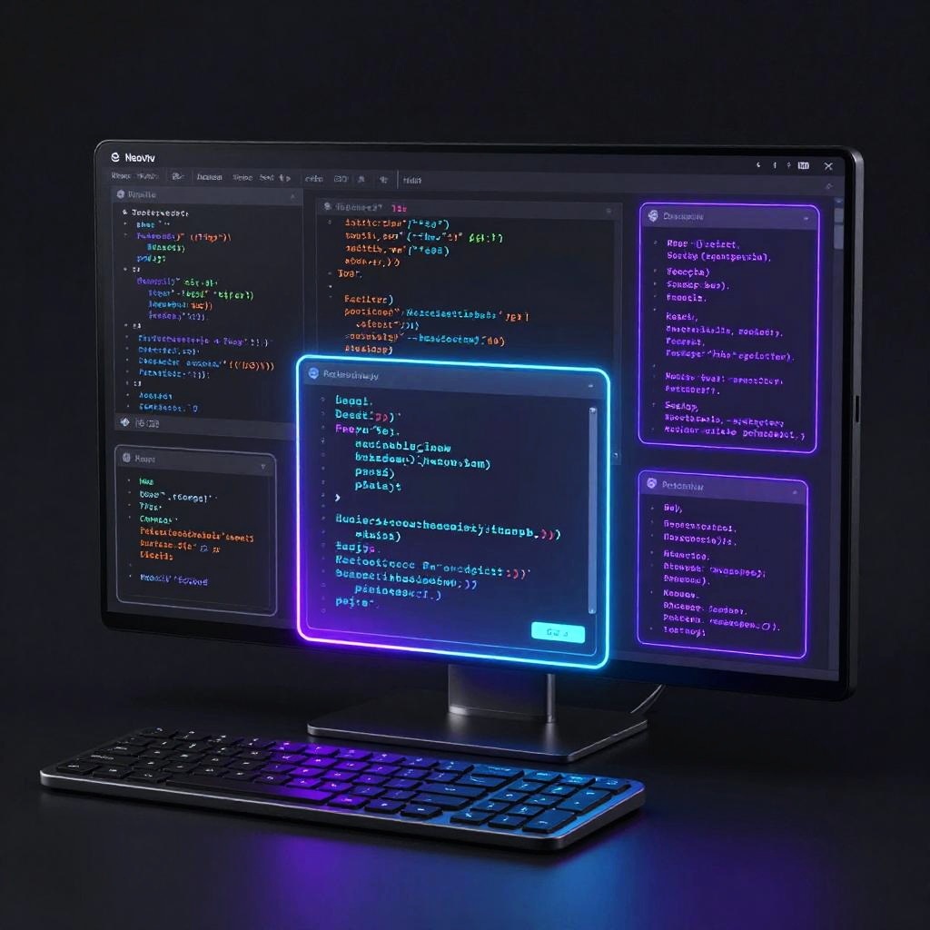 Neovim editor interface with futuristic holographic coding elements, glowing syntax highlights in neon blue and purple, minimalist dark mode background, ultra-modern developer workspace, sleek keyboard and multiple floating code windows, cyberpunk style.