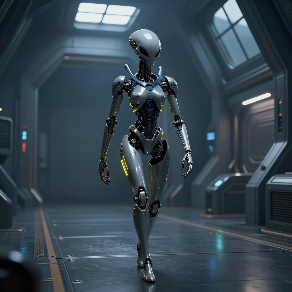 Futuristic digital artwork of a sleek alien rogue robot with glowing yellow accents walking confidently inside a shadowy spaceship hangar illuminated by dim ambient blue light. The high-tech environment features metallic walls, reflective floor, and an arched ceiling with large windows allowing light to filter through.